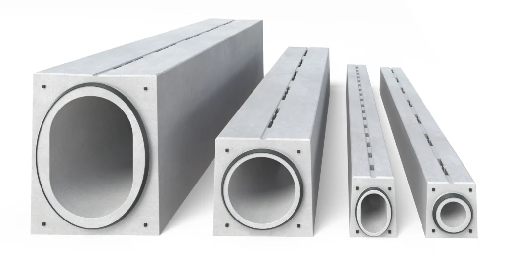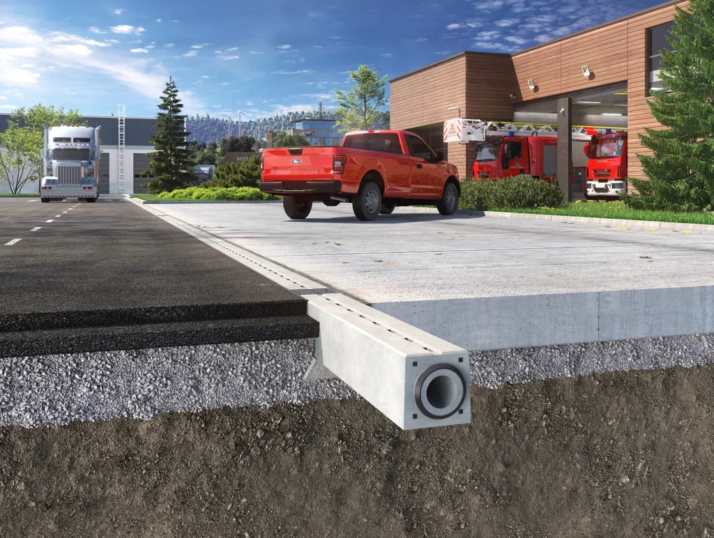 The 8,000-psi reinforced concrete channels are available to meet or exceed AASHTO HS20/HS25 load specifications, FAA commercial airport loading requirements, and the EN1433 Load Class D, E and F requirements. In addition, their monolithic design offers exceptional strength, eliminates traffic vibration noise, and have no loose parts or grates to create a hazard. Units are simply set on a prepared base without the need for a concrete surround, creating significant installation time and cost benefits. Install time for a 12′ length of 12″ diameter channel after base preparation is estimated at 5 minutes.
